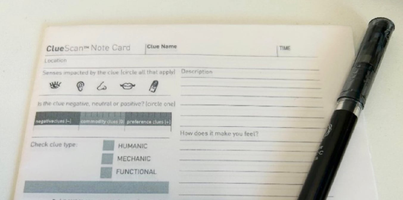 クルースキャンとは、簡単に説明すると、観察や体験を通して、意識レベル/無意識レベルで顧客経験に影響を与えている五感の要素=手がかり(clue)を抽出するというものです。(詳しくはこちらのブログをご覧ください→五感レベルでサービスをデザインする。)